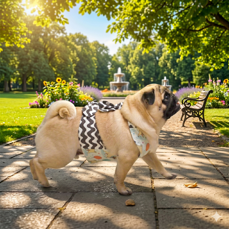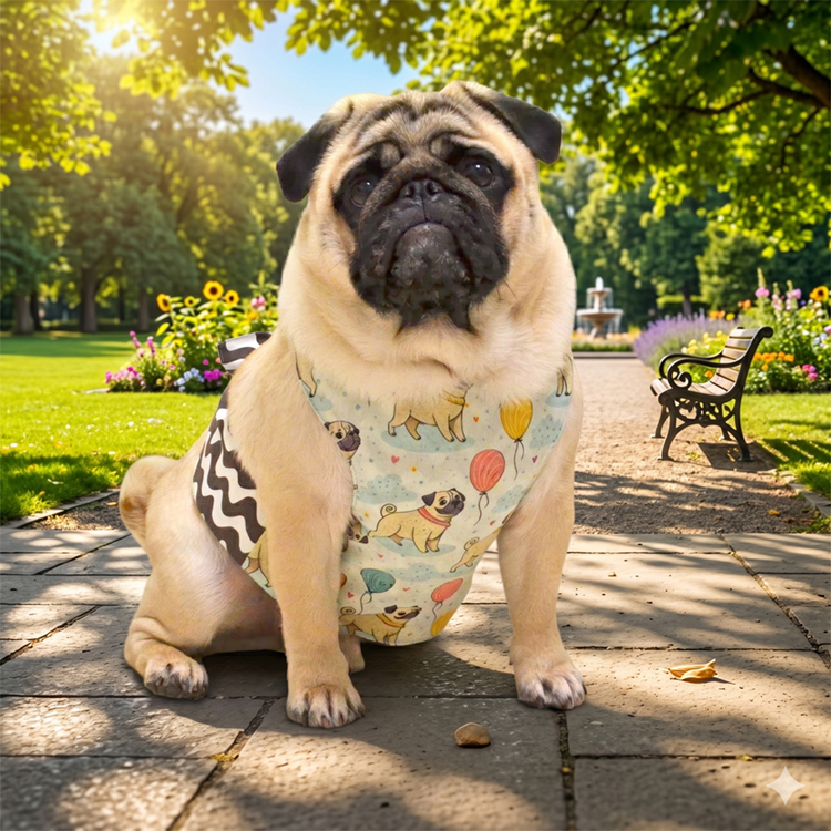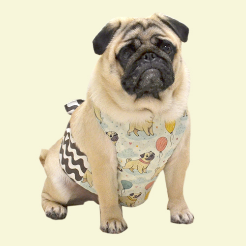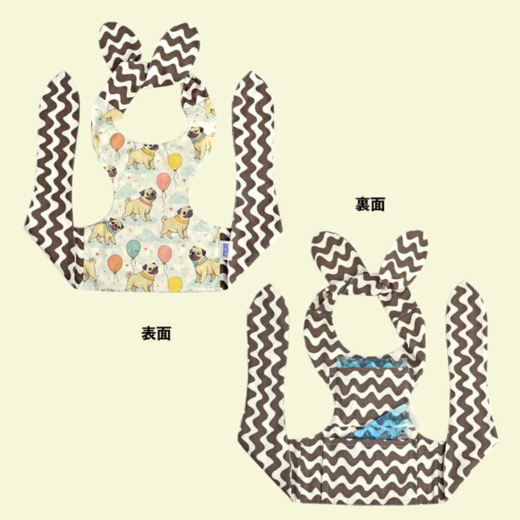 可愛いパグちゃんと風船がプリントされた、優しい雰囲気の生地を使ったクールエプロンです。